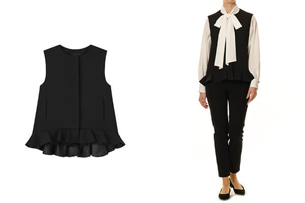 華やかなフリルを裾にあしらった、女性らしいムード漂うジレ。