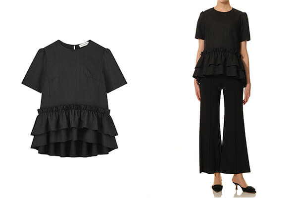 ウエスト位置からたっぷりとあしらったフリルが印象的なペプラムデザインは、