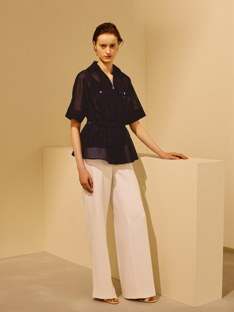 襟元はシャツカラーとシャープなVネックデザインに仕上げており、首元を美しく見せながらお顔周りをすっきりとした印象へ導きます。