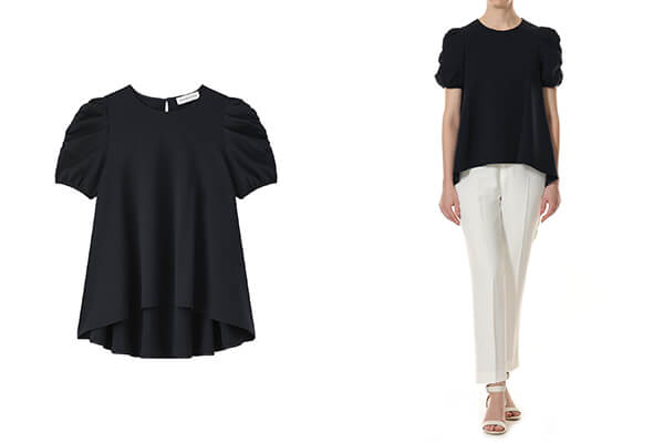 シンプルなクルーネックデザインに、肩から袖にかけて施したシャーリングが美しいドレープを生み出し、ボリュームのあるパフスリーブが女性らしい華やかさを添えてくれます。
