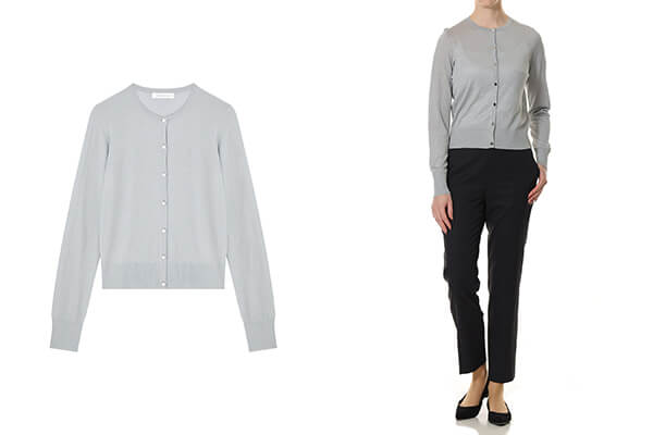 上品な輝きを纏うシルバーのラメ素材が、シンプルなデザインにさりげない華やぎを添えるクルーネックカーディガン。