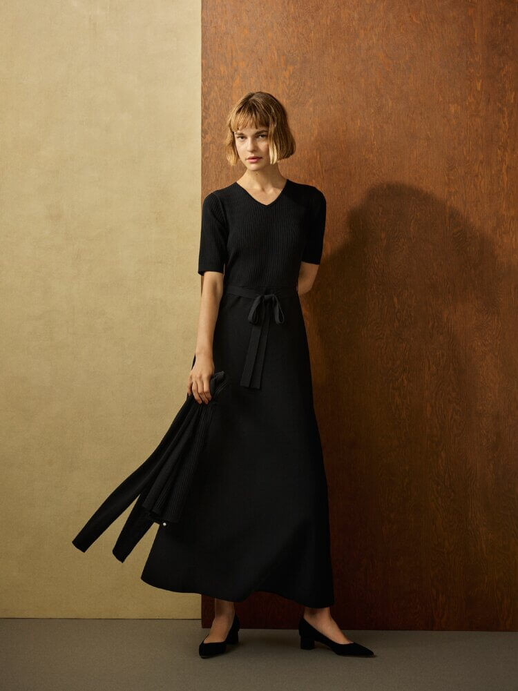 ウエストリボンVネックニットワンピース