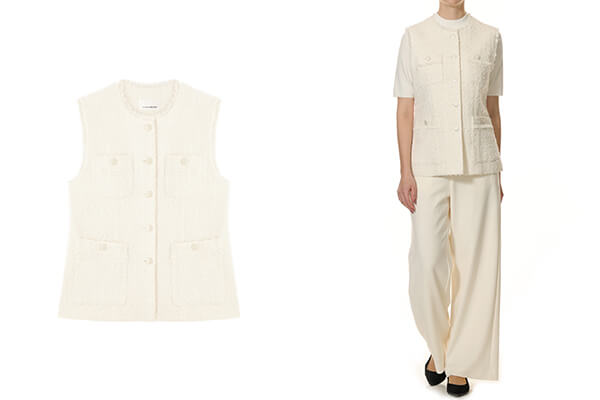 上品な表情を纏うツイード素材を使用したジレは、クラシカルな気品と洗練された存在感を兼ね備えた一着。