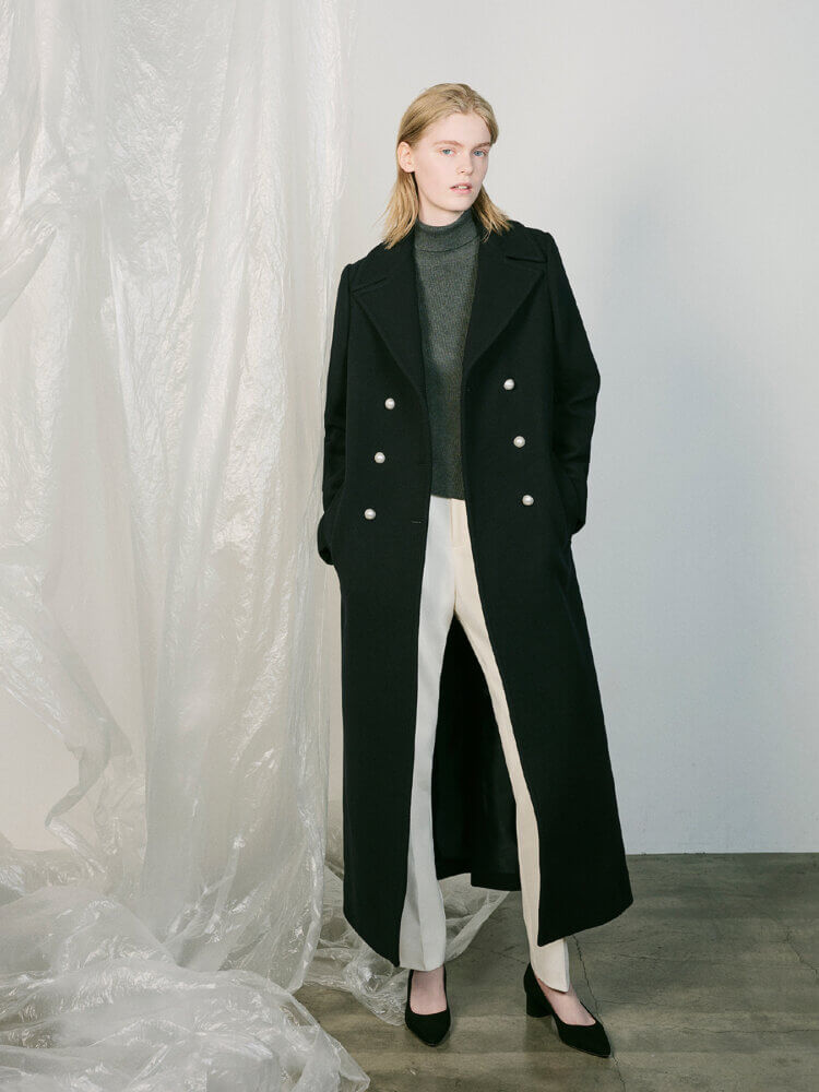 前身頃の大ぶりのパールボタンが、エレガントな雰囲気を醸し出すダブルブレストのロングコート。