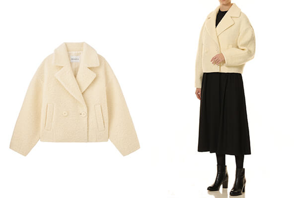 ふんわりとしたループ状の糸が生み出す温かな表情と、端正なテーラードカラーのコントラストが美しいショートコート。